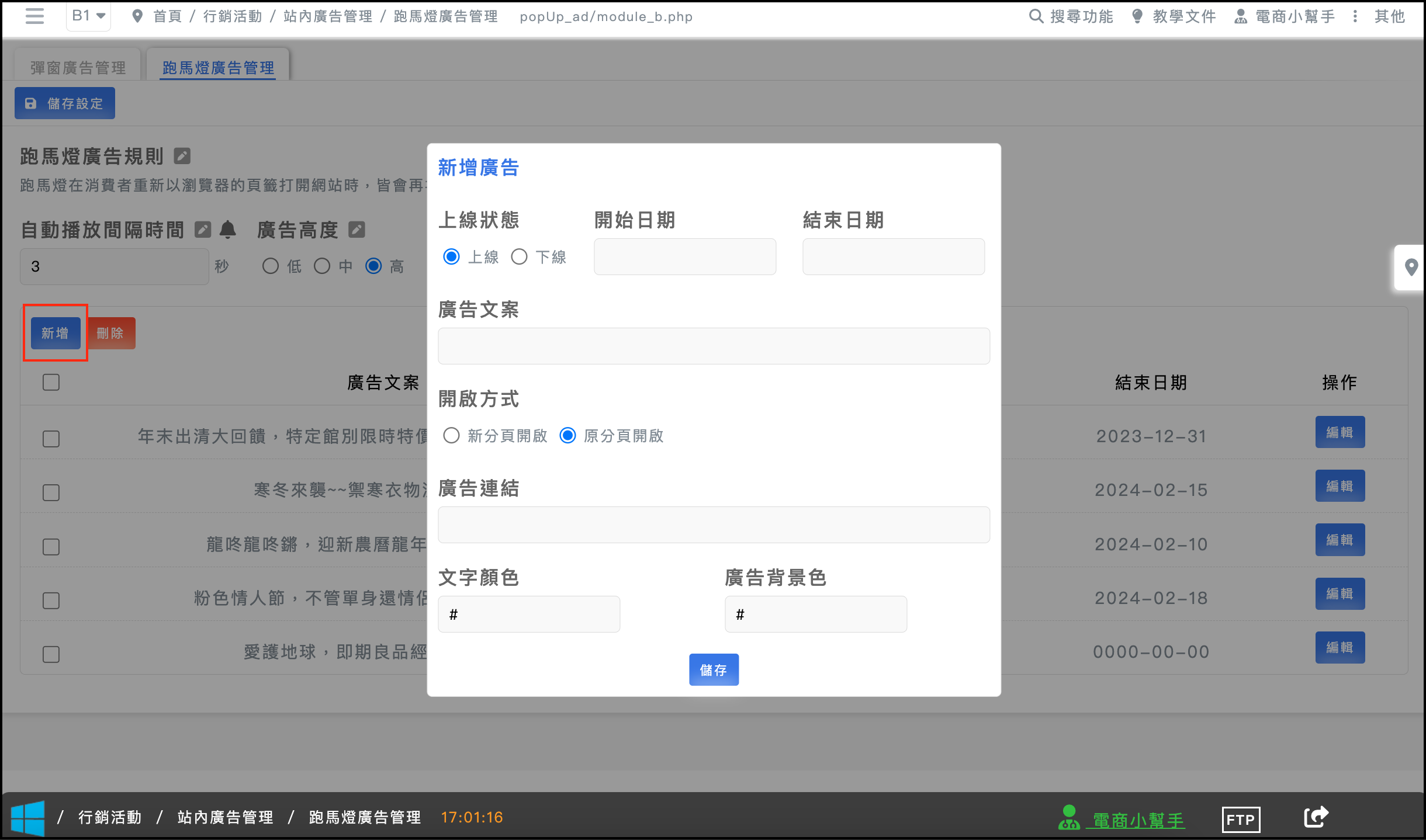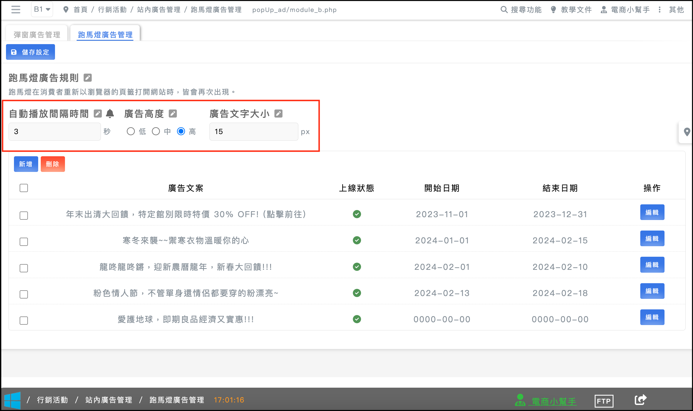 路徑:行銷活動 > 站內廣告管理 > 跑馬燈廣告管理