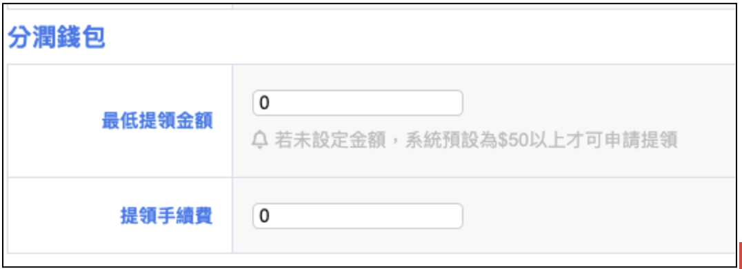 2.手續費可由商家自行設定,於後台會員管理 > 分銷模式設定 > 分銷模式設定的「分潤錢包」中設定