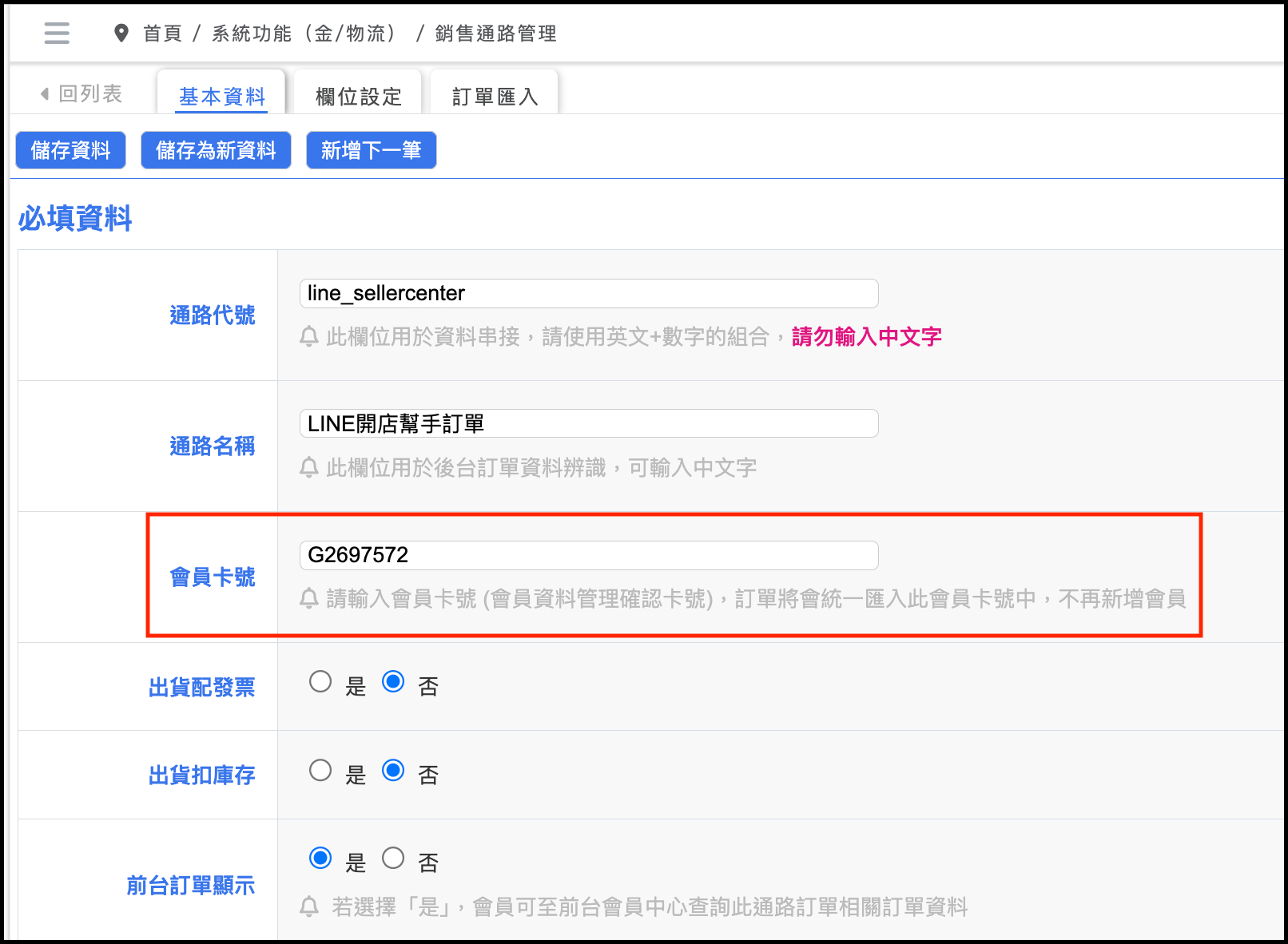卡號綁定: 至【系統功能】>【銷售通路管理】,將上述會員卡號輸入對應欄位。