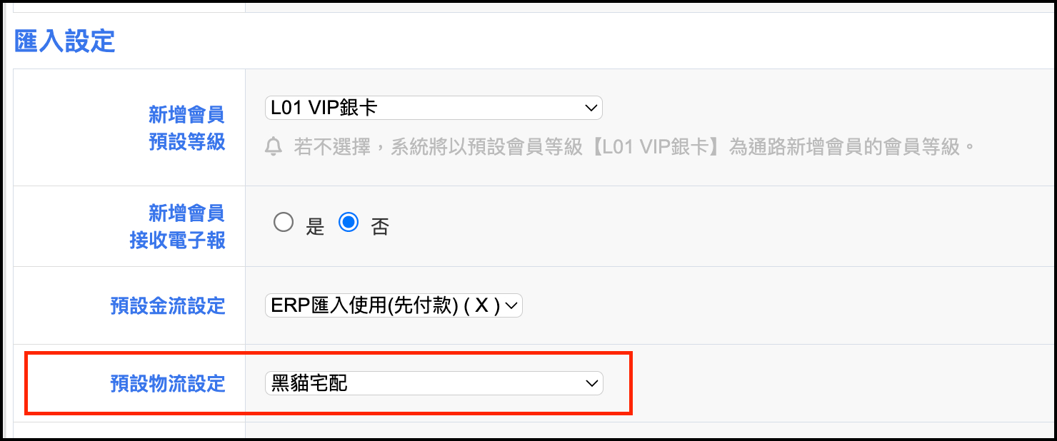 預設物流設定:若需指定宅配串接物流,可於【系統功能】>【銷售通路管理】的匯入設定內選擇指定物流