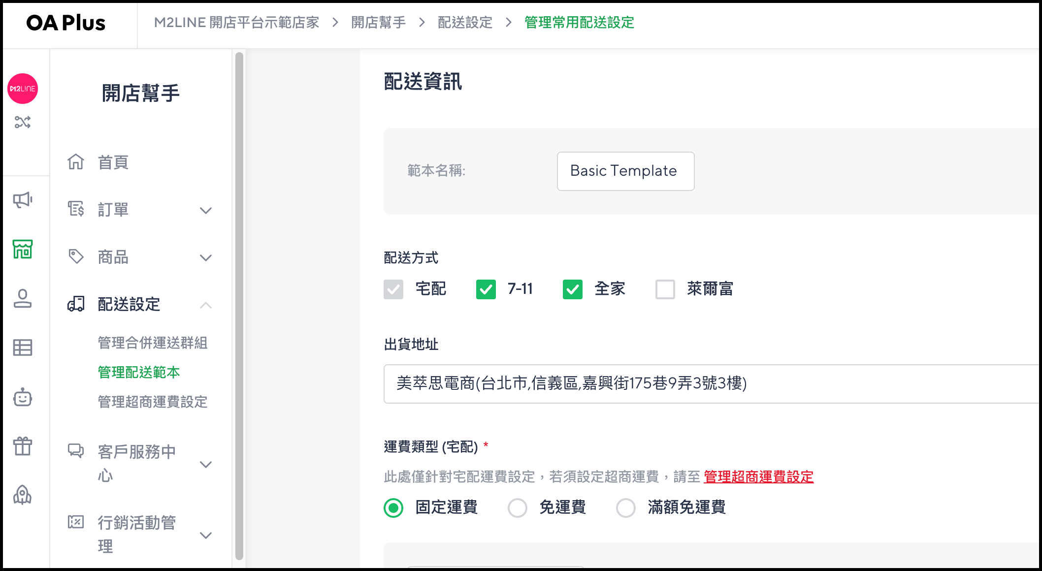 宅配運費: 在配送範本中,可選擇「固定運費」、「免運費」或「滿額免運費」。