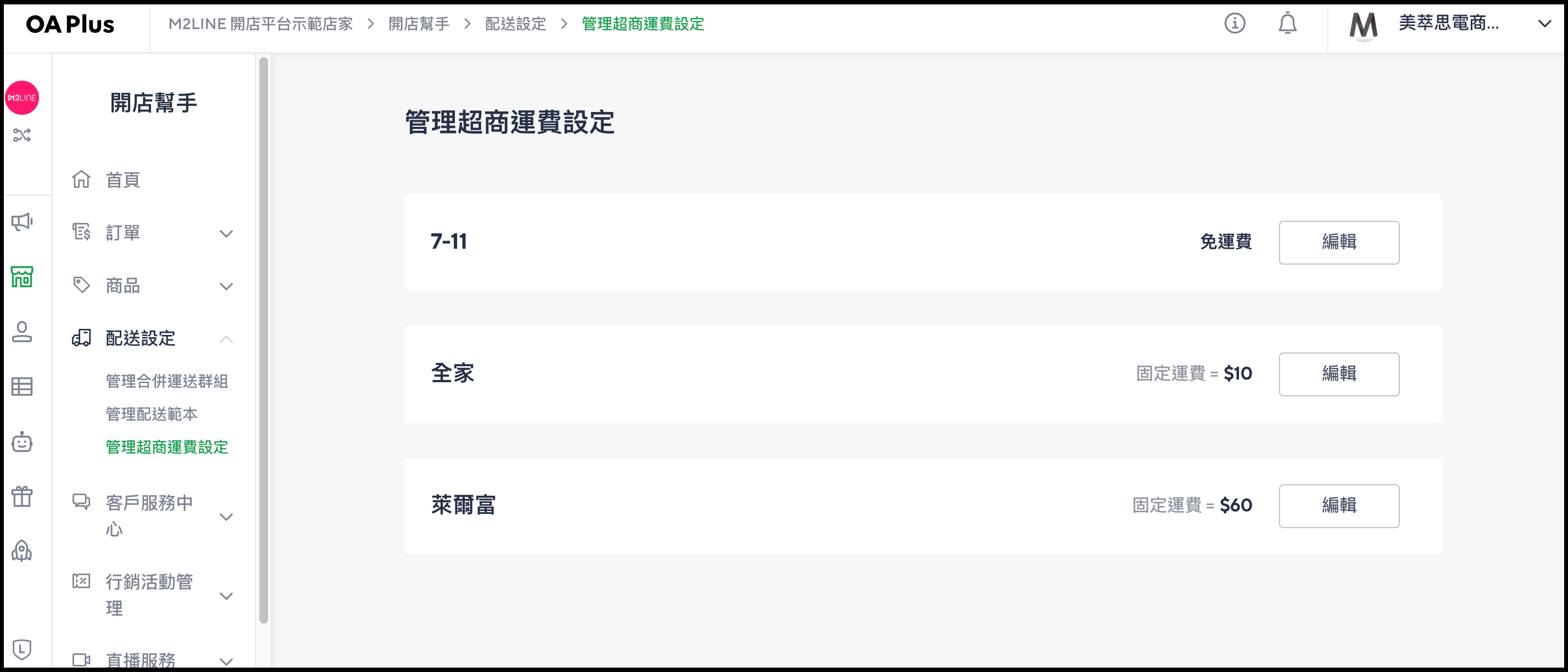 超商運費: 請至【配送設定】>【管理超商運費設定】,針對不同超商(如 7-11、全家)分別點選「編輯」來輸入各自的運費金額。