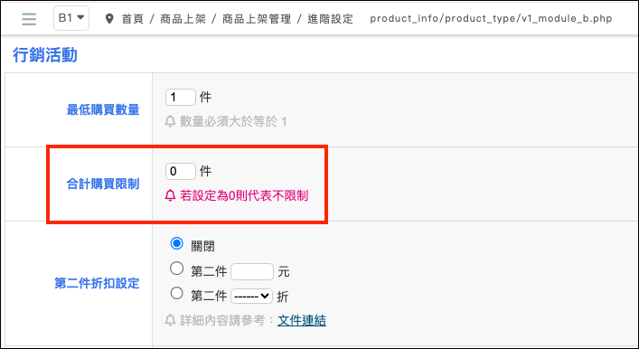 路徑:商品上架 > 商品上架管理 > 進階設定 > 合計購買限制